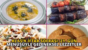 Ramazan'ın 21. gününe özel hazırlanan klasik iftar menüsü, Türk mutfağının sevilen lezzetlerini sofralara taşıyor. Bu özel menü, hem doyurucu hem de damaklarda iz bırakacak tarifleriyle iftar sofralarını şenlendirmeyi amaçlıyor.